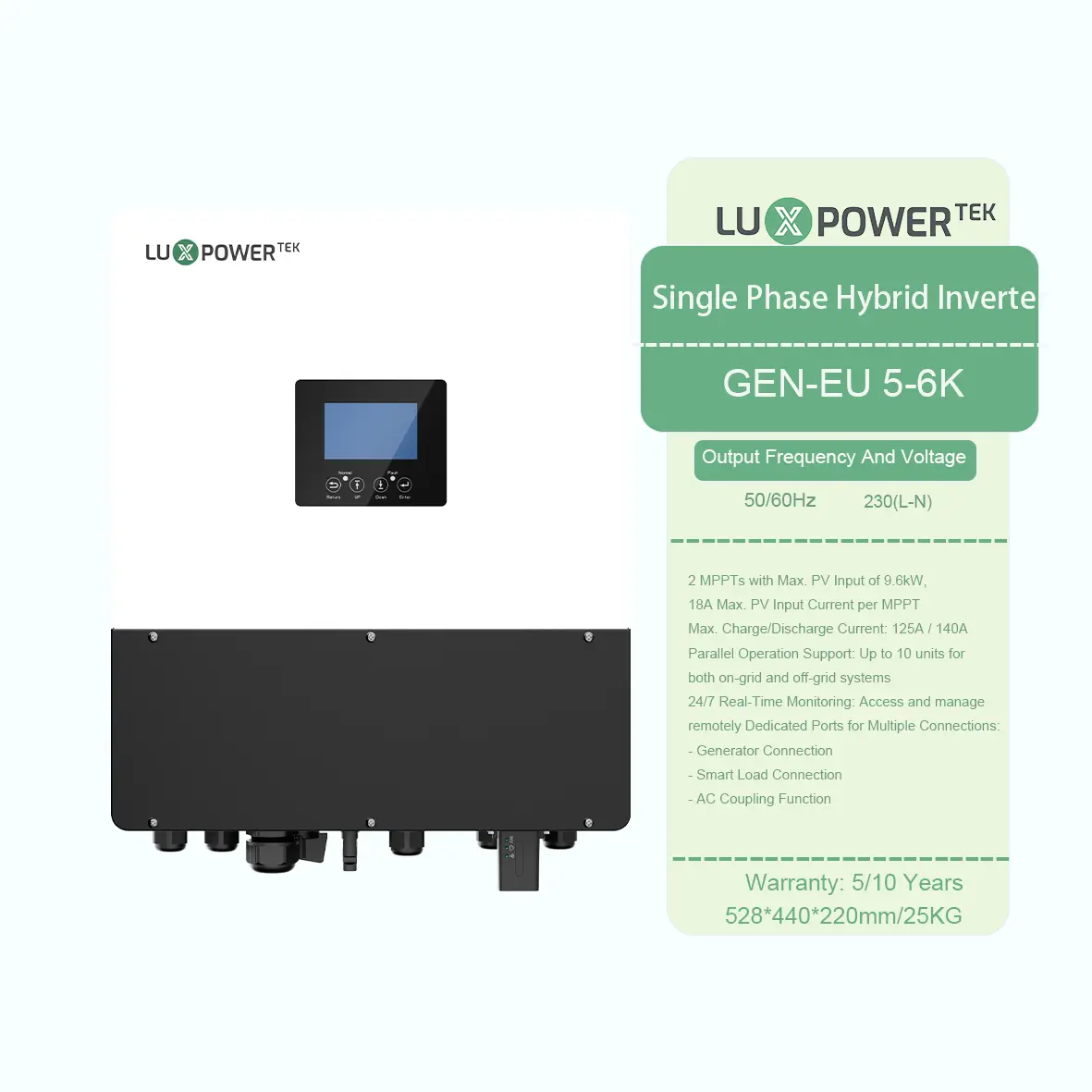 De nieuwste Luxpower Gen2-LB-EU 3-6K is de directe upgrade naar de Gen-LB-EU 3-6K, die superieure prestaties en veerkracht oplevert. Met dubbele MPPT -trackers, maximaliseert het de zonne -oogst met een max PV -ingang van 9,6 kW. Elk MPPT ondersteunt 18A en werkt efficiënt over een breed 100-530V -ingangsbereik.