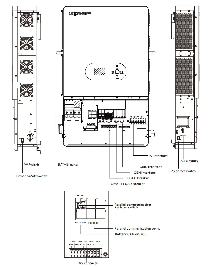 De Luxpower SNA-US 12000 is ontworpen voor veerkracht en beschikt over dubbele AC-uitgangspoorten voor connectiviteit met meerdere ladingen en een robuuste 100A continue passhrough-mogelijkheden. De speciale generatorpoort en naadloze overgangs/off-grid-overgang zorgen voor een ononderbroken stroomvoorziening in veeleisende omstandigheden.